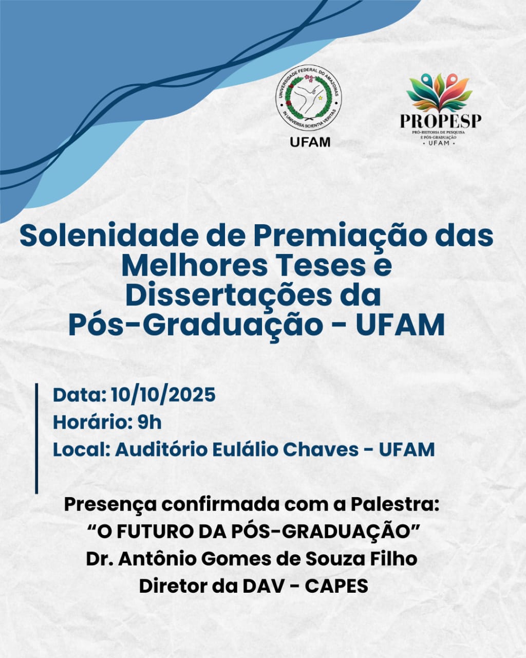 A Pró-reitoria de Pesquisa e Pós-graduação da UFAM - PROPESP, tem a satisfação de convidar a toda a comunidade acadêmica para participar da Cerimônia de Premiação das Melhores Teses e Dissertações dos Programas de Pós-Graduação da UFAM defendidas em 2024, que ocorrerá no dia 10/10/2025, às 9h, no Auditório Eulálio Chaves da UFAM.